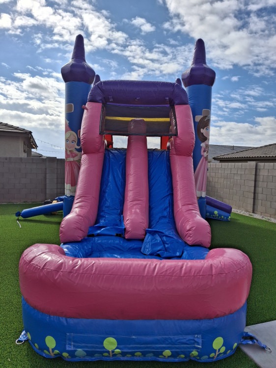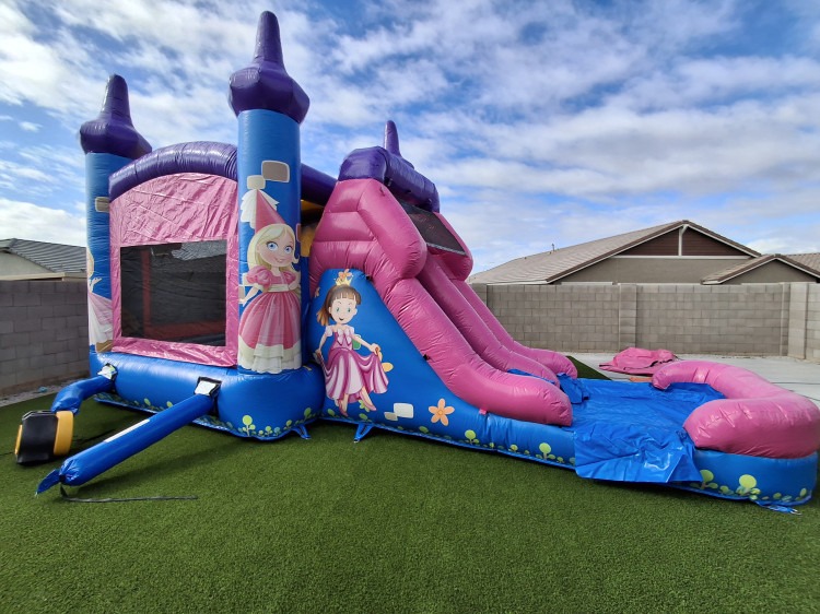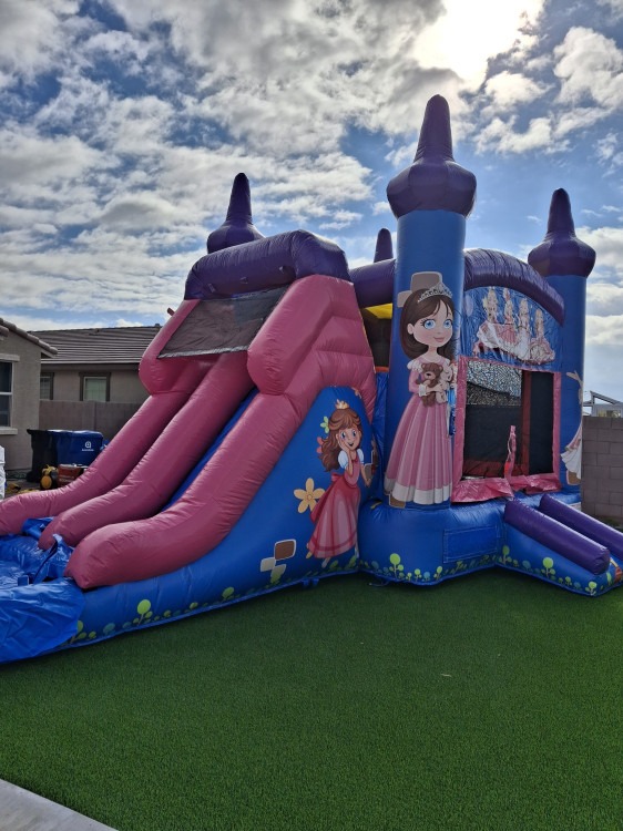 A spacious, eye-catching fairytale-themed wet/dry combo measuring 28' long x 13' wide x 14' high that gives you two fun options in one rental. Use it dry for bouncing, climbing, and sliding at backyard parties, school events, or community gatherings, or add water for a refreshing wet slide experience on hot days. The unit features a roomy inflatable bouncing area, an internal climbing wall that leads to a tall slide, and safety netting and high walls to help keep guests contained while they play. Its generous size accommodates larger groups and older kids while still being family-friendly, and the themed graphics add a whimsical touch to birthdays, themed celebrations, and photo-ready setups. Designed for easy setup and versatile use, this combo delivers hours of active, supervised entertainment whether you want splashes and cooling thrills or a dry day of energetic play.